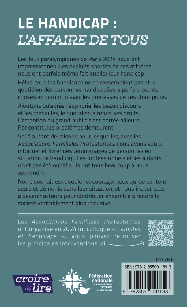 Hélas, tous les handicaps ne se ressemblent pas et le quotidien des personnes handicapées a parfois peu de choses en commun avec les prouesses de ces champions. Ajoutons qu’après l’euphorie, les beaux discours et les médailles, le quotidien a repris ses droits. L’attention du grand public s’est portée ailleurs. Par contre, les problèmes demeurent. Voilà autant de raisons pour lesquelles, avec les Associations Familiales Protestantes, nous avons voulu informer et livrer des témoignages de personnes en situation de handicap. Les professionnels et les aidants n’ont pas été oubliés. Ils ont tous beaucoup à nous apprendre.