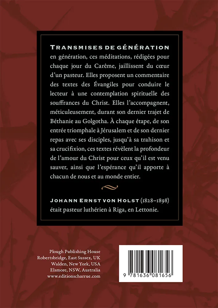 Transmises de génération en génération, ces méditations, rédigées pour chaque jour du Carême, jaillissent du coeur d’un pasteur. Elles proposent un commentaire des textes des Évangiles pour conduire le lecteur à une contemplation spirituelle des souffrances du Christ. Elles l’accompagnent, méticuleusement, durant son dernier trajet de Béthanie au Golgotha. À chaque étape, de son entrée triomphale à Jérusalem et de son dernier repas avec ses disciples, jusqu’à sa trahison et sa crucifixion, ces textes révèlent la profondeur de l’amour du Christ pour ceux qu’il est venu sauver, ainsi que l’espérance qu’il apporte à chacun de nous et au monde entier.