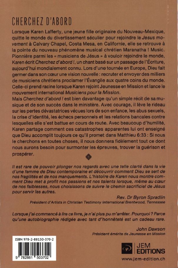 Lorsque Karen Lafferty, une jeune fille originaire du Nouveau-Mexique, quitte le monde du divertissement séculier pour rejoindre le Jesus movement à Calvary Chapel, Costa Mesa, en Californie, elle se retrouve à la pointe du nouveau phénomène musical chrétien Maranatha ! Music. Pionnière parmi les « musiciens de Jésus » à vouloir rejoindre le monde, Karen écrit Cherchez d’abord, un chant basé sur un passage de l’Écriture, aujourd’hui mondialement connu. Lors d’une tournée en Europe, Dieu fait germer dans son coeur une vision nouvelle : recruter et envoyer des milliers de musiciens chrétiens proclamer l’Évangile aux quatre coins du monde. Celle-ci prend racine lorsque Karen rejoint Jeunesse en Mission et lance le mouvement international Musiciens pour la Mission. Mais Cherchez d’abord est bien davantage qu’un simple récit de sa musique et de son succès dans le ministère. Avec courage, il lève le rideau sur les pertes dévastatrices vécues lors de son enfance, les abus sexuels, la crise d’identité, les échecs personnels et les relations bancales contre lesquelles elle s’est battue en cours de route. Avec beaucoup d’humilité, Karen partage comment ces catastrophes apparentes lui ont enseigné que Dieu accomplit toujours ce qu’il promet dans Matthieu 6:33 : Si nous le cherchons en toutes choses, il nous donnera fidèlement tout ce dont nous aurons besoin pour surmonter les épreuves, trouver la guérison et prospérer.