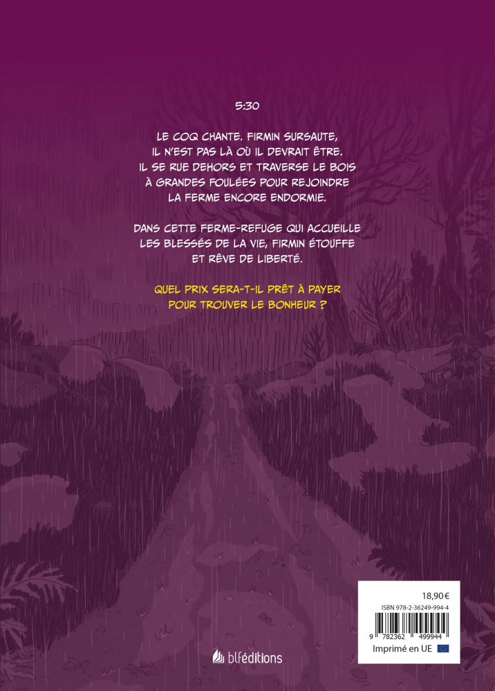 Le coq chante. Firmin sursaute, il n’est pas là où il devrait être. Il se rue dehors et traverse le bois à grandes foulées pour rejoindre la ferme encore endormie. Dans cette ferme-refuge qui accueille les blessés de la vie, Firmin étouffe et rêve de liberté.